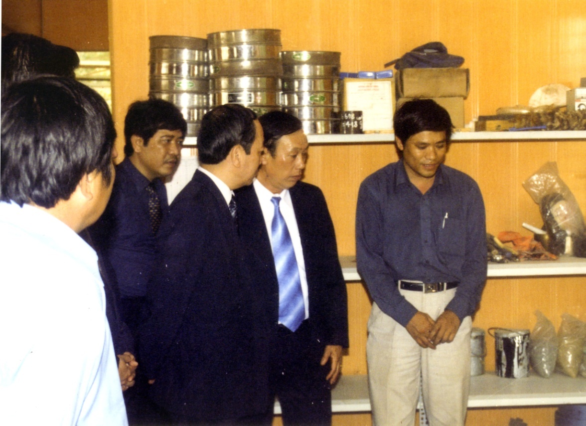 Giám đốc Đinh Xuân Viên đang giới thiệu với đồng chí Phan Diễn – nguyên thường trực Ban Bí Thư Trung Ương Đảng, Uỷ Viên Bộ Chính trị và các Ban lãnh đạo Nhà nước về công tác Thí nghiệm kiểm tra chất lượng vật liệu thi công công trình