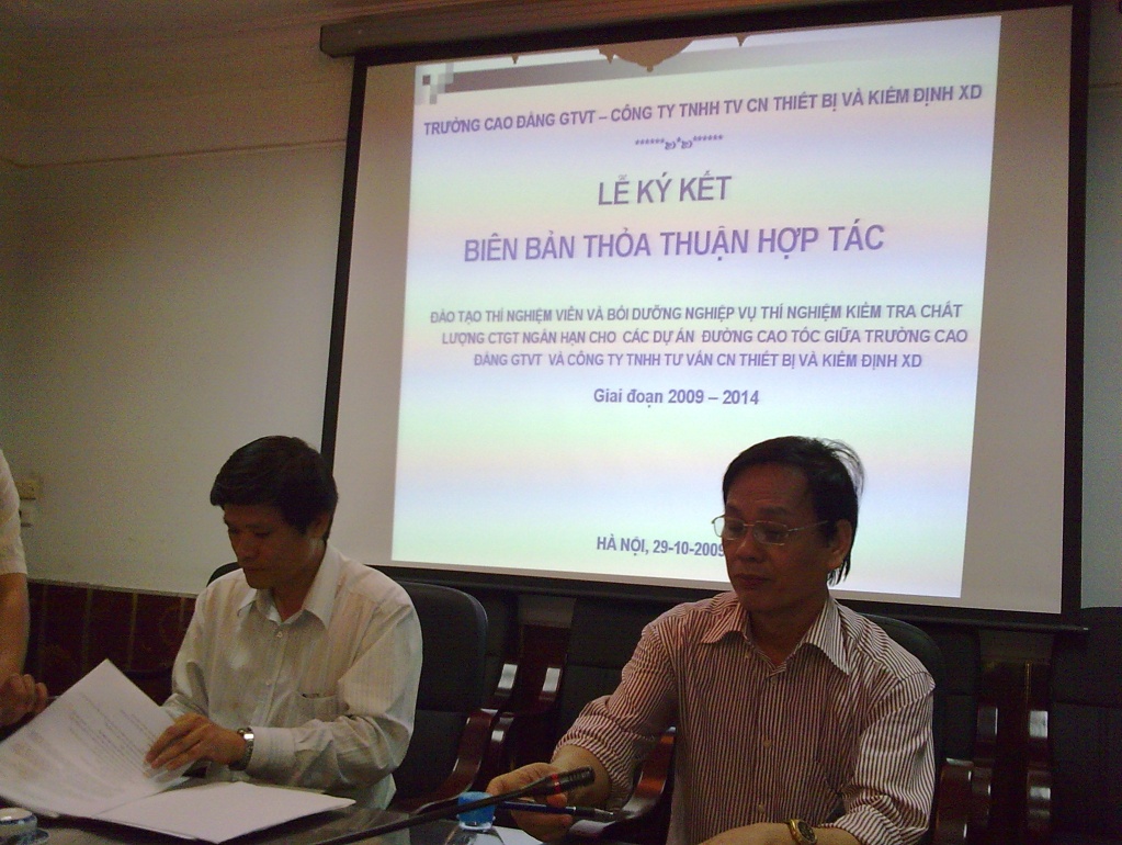 Ban lãnh đạo công ty làm việc với ban lãnh đạo trường Đại học công nghệ giao thông vận tải về ký kết biên bản thoả thuận hợp tác về Đào tạo thí nghiệm viên và bồi dưỡng nghiệp vụ thí nghiệm kiểm tra chất lượng CTGT cho các dự án đường cao tốc